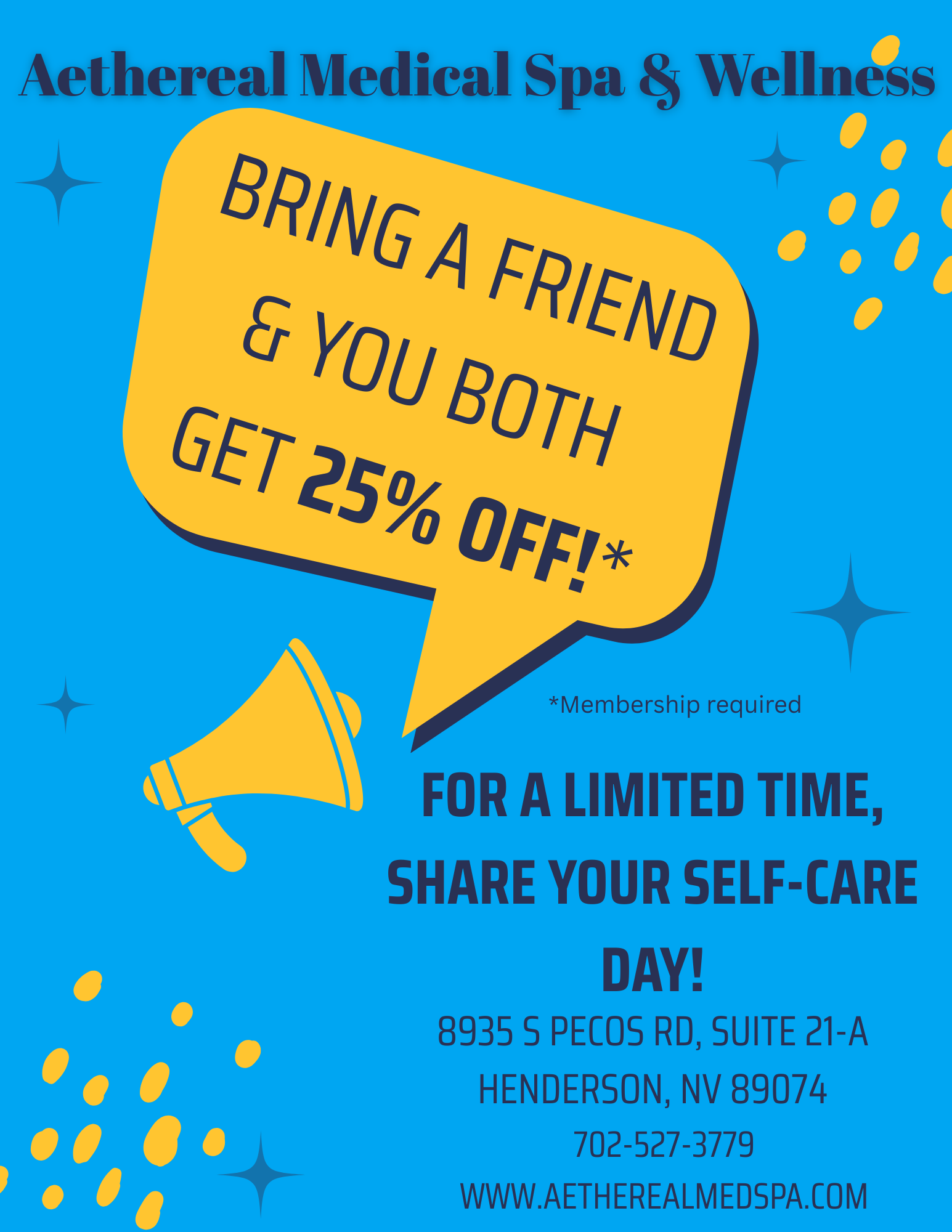 Members – Bring a friend for a service the same day and you BOTH get 25% off your services at membership pricing if your friend joins that day.